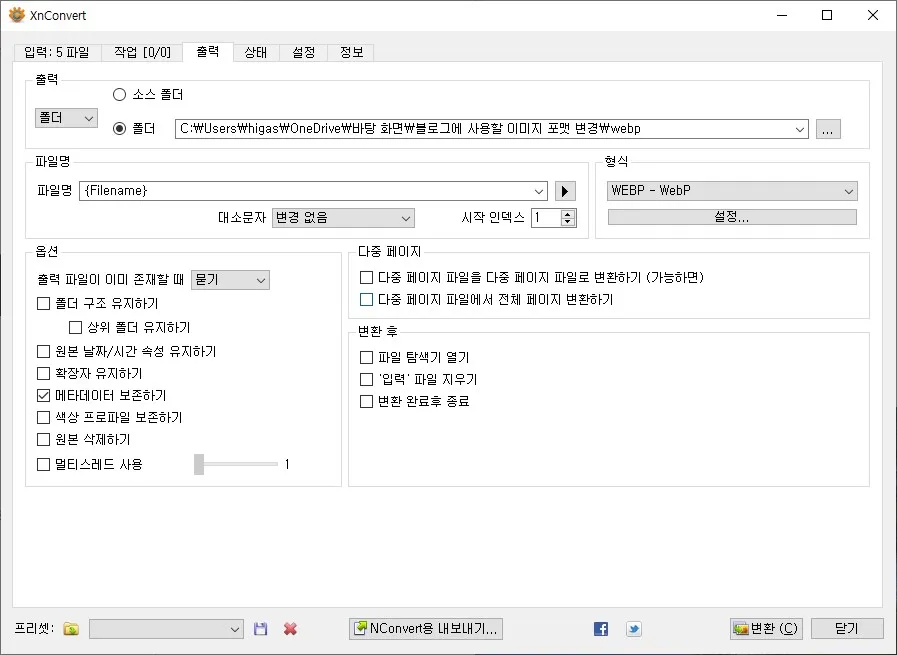 Convertio를 사용하는 것보다 훨씬 빠른 속도로 변환이 가능하며, 사용했던 설정 정보는 저장이 되어 프로그램을 다시 실행했을 때에는 변환할 파일을 끌어다 놓은 후에 '변환' 버튼만 클릭하면 됩니다.