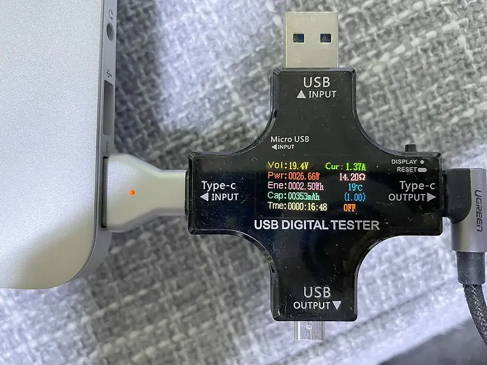 정품 충전기의 출력이 14.85V, 3.05A로 최대 45W 충전할 수 있습니다. 커넥터로 연결해서 측정해보니 20V, 1.37A로 약 26W 정도로 충전되는 것을 보았을 때 충전 자체에 큰 문제가 있지는 않을 것 같습니다. 참고로 모든 노트북은 배터리가 거의 없을 때에 최고 속도로 충전하고 배터리가 충전될수록 충전 속도는 낮아지게 됩니다.