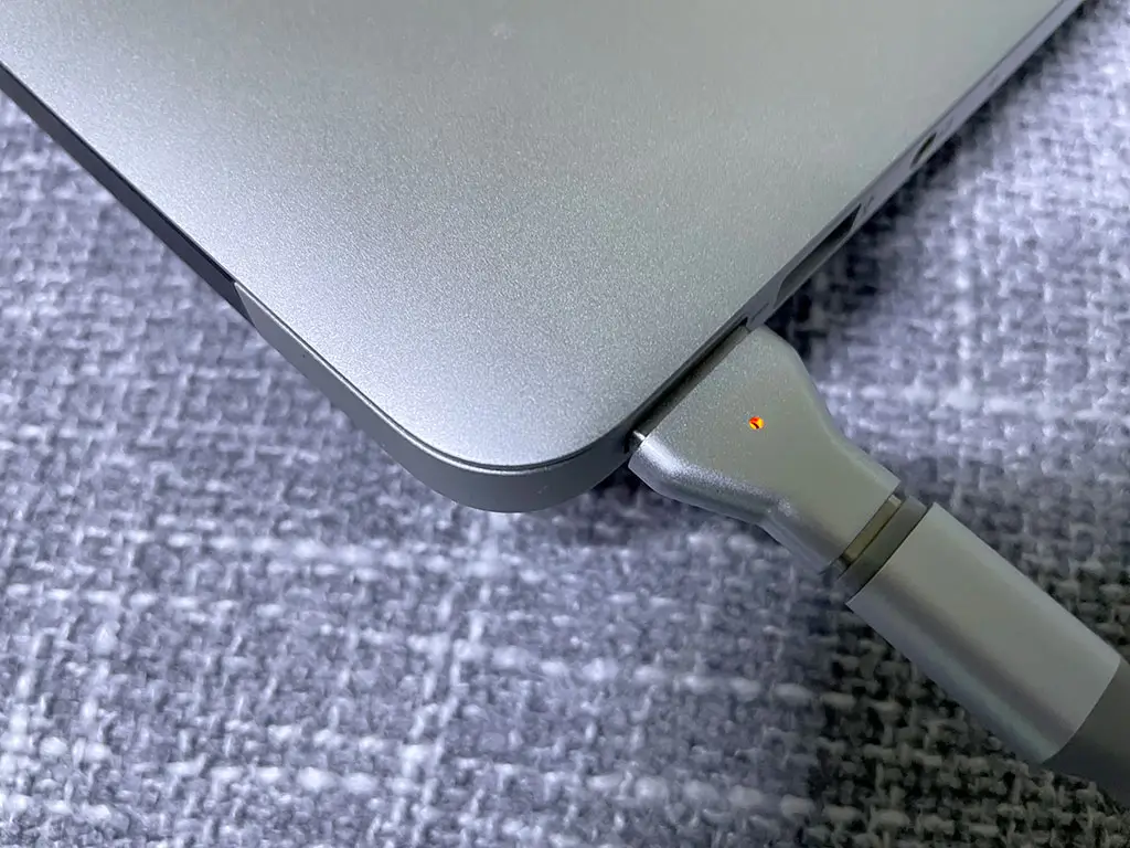 그래서 자력 자체가 약한 느낌이 들지 않는데도 살짝 건드리면 충전 단자가 맥북에서 분리가 되었습니다. 케이블의 무게가 가벼운 것을 사용하면 나아지기는 하지만 정품에 비해 너무 쉽게 분리가 된다는 느낌은 그대로입니다.