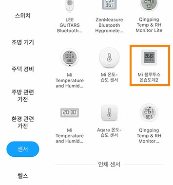 앱을 실행한 후에 우측 상단에 있는 + 기호를 클릭하면 제품을 선택할 수 있는 화면으로 전환되는데 중간 정도에 있는 센서를 선택하면 우측에서 "Mi 블루투스 온습도계2"를 볼 수 있습니다.